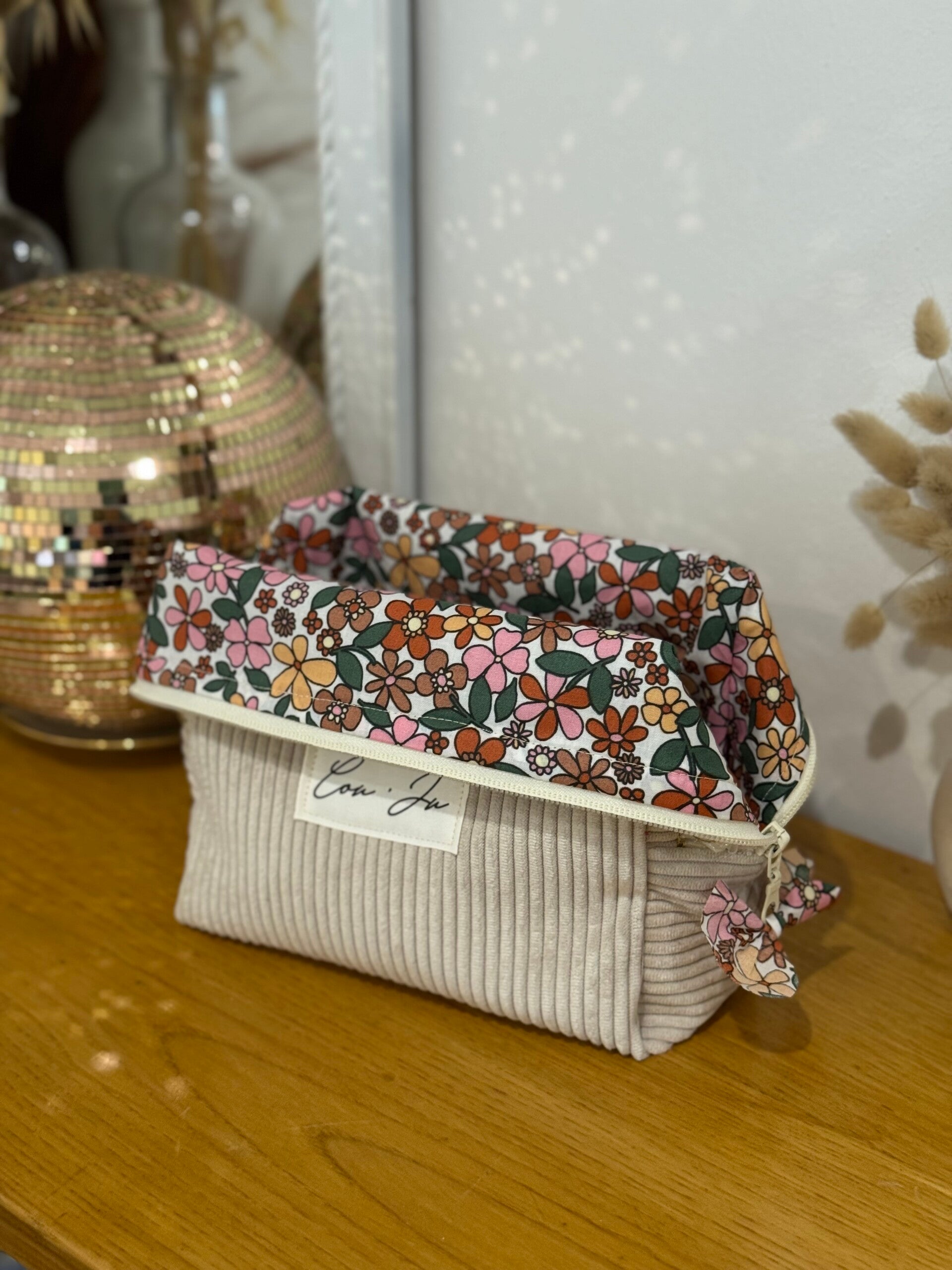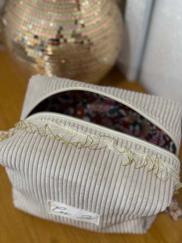 Trousse de toilette cousue à la main dans un velours côtelé blanc cassé, tout doux et lumineux.